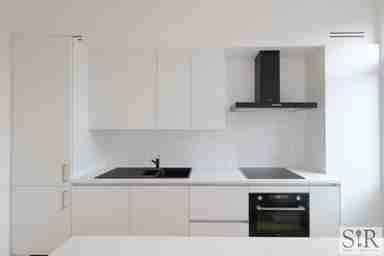 De duplex beschikt op de eerste verdieping over een bijzonder gezellige en ruime leefruimte. Dankzij de grote ramen geniet je van overvloedig natuurlijk licht en een mooi uitzicht op het Louis De Naeyerplein. De warme tinten van de houten vloer geven de ruimte extra karakter en sfeer. Aansluitend bevindt zich de volledig open en ingerichte keuken met een royaal aanrecht, ideaal als eettafel of perfecte plek voor een aperitief. Het vernieuwde interieur, met zijn moderne afwerking en warme uitstraling, creëert een erg aangename woonbeleving. Ook is er een gastentoilet aanwezig in de hal.