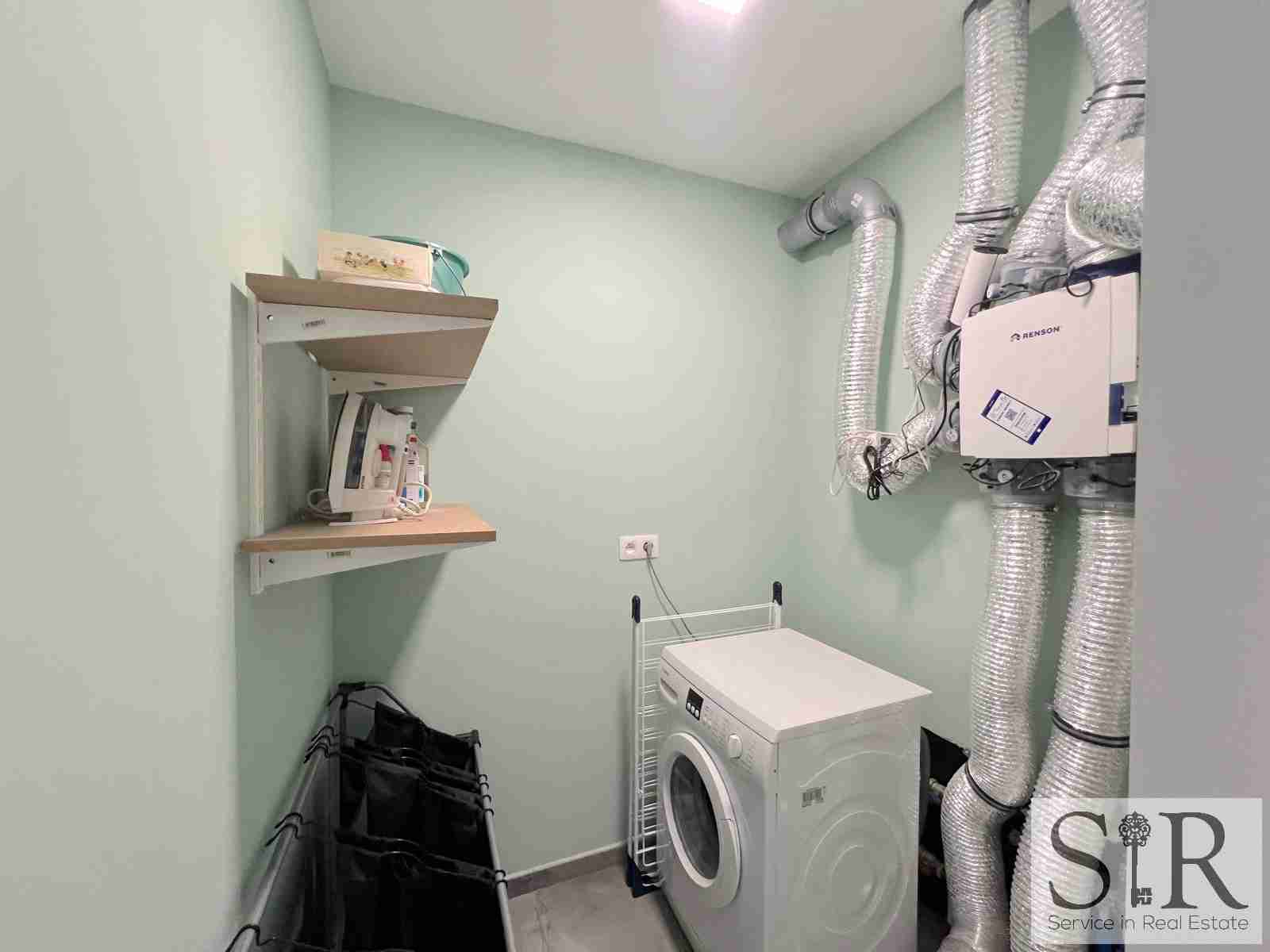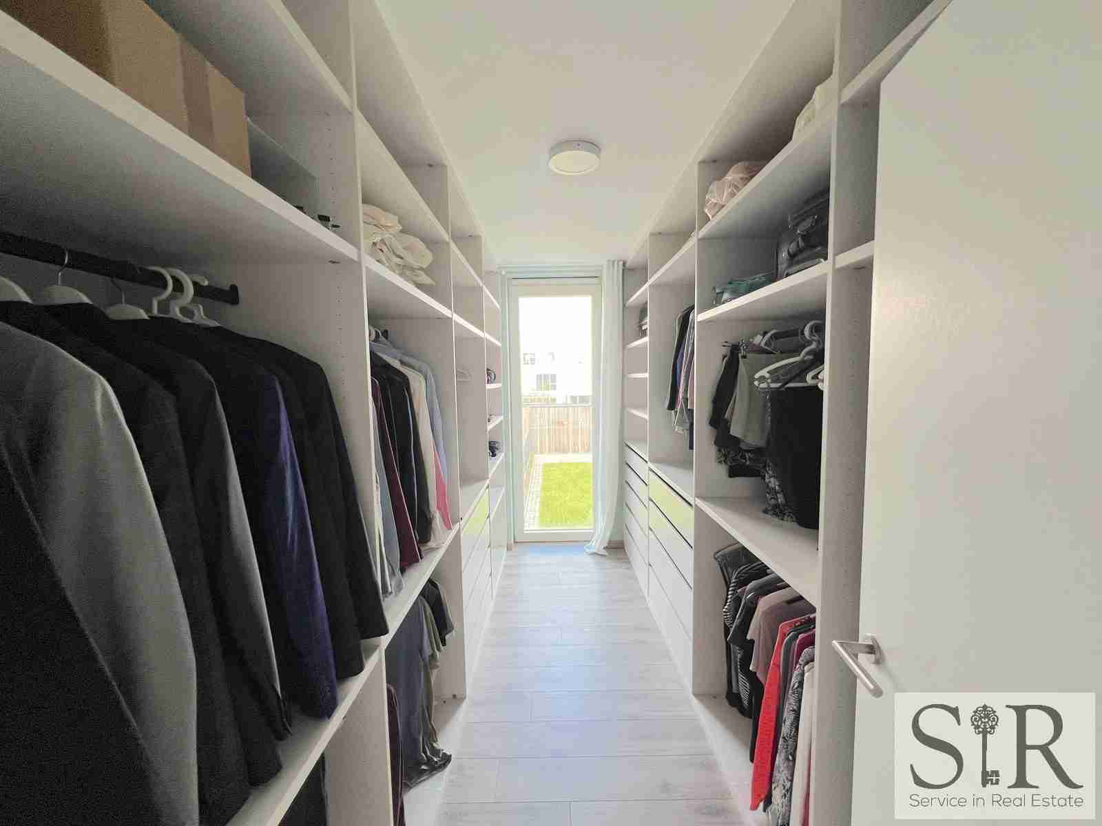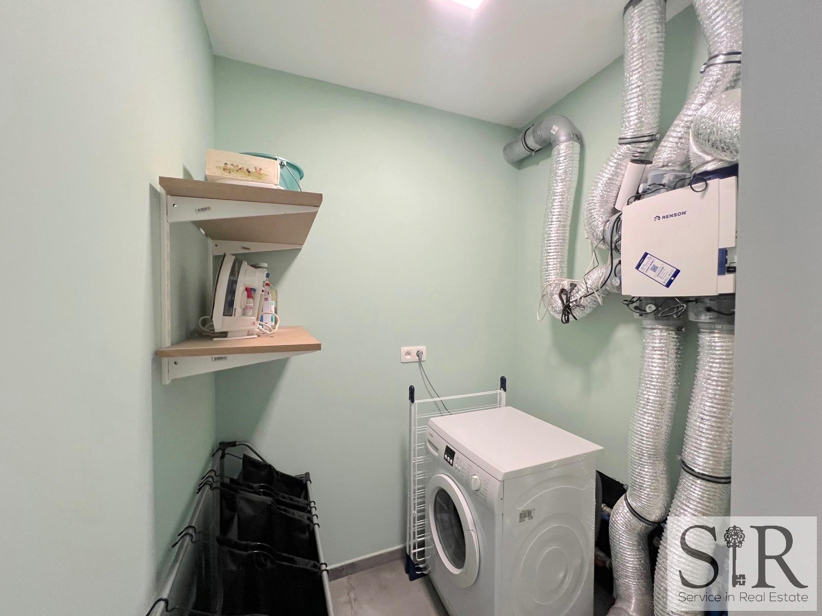 De woning is gericht op veel opbergruimte. Er bevinden zich doorheen de woning veel op maat gemaakte kasten.