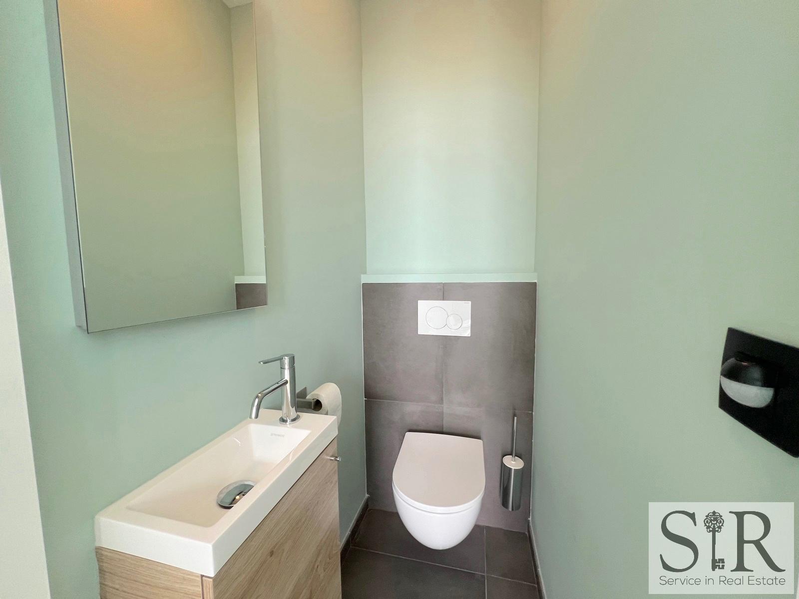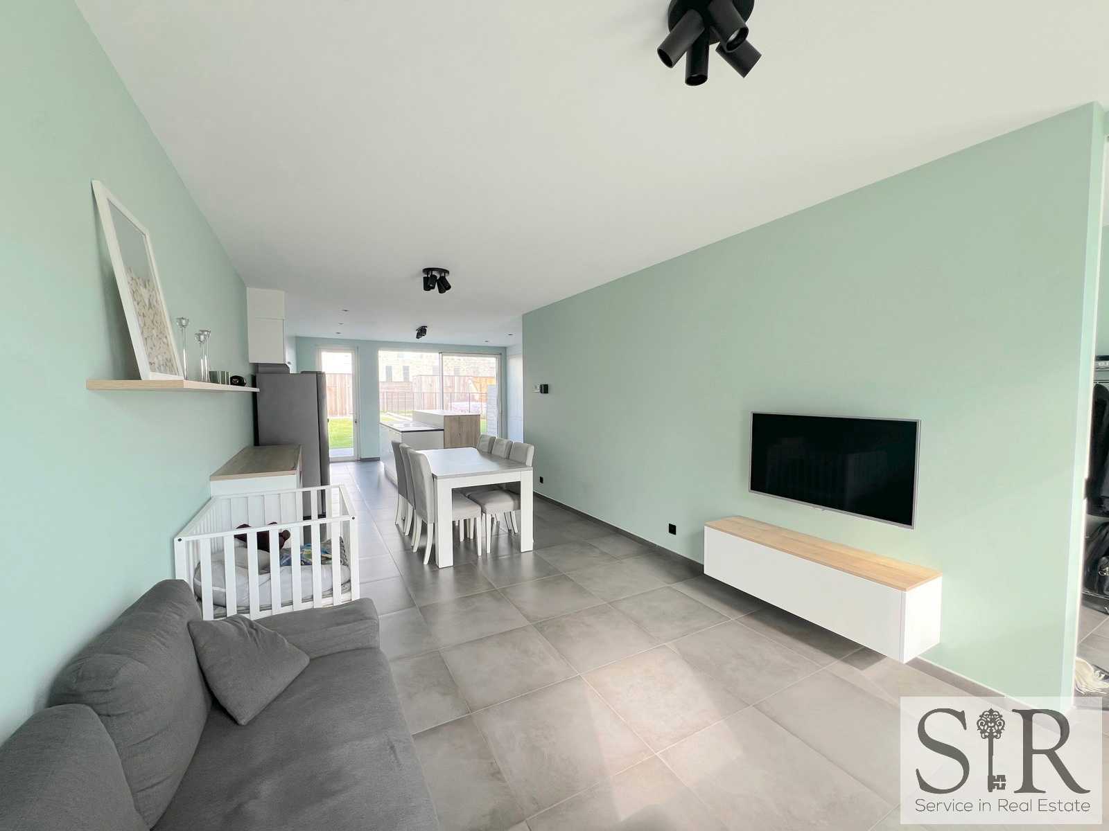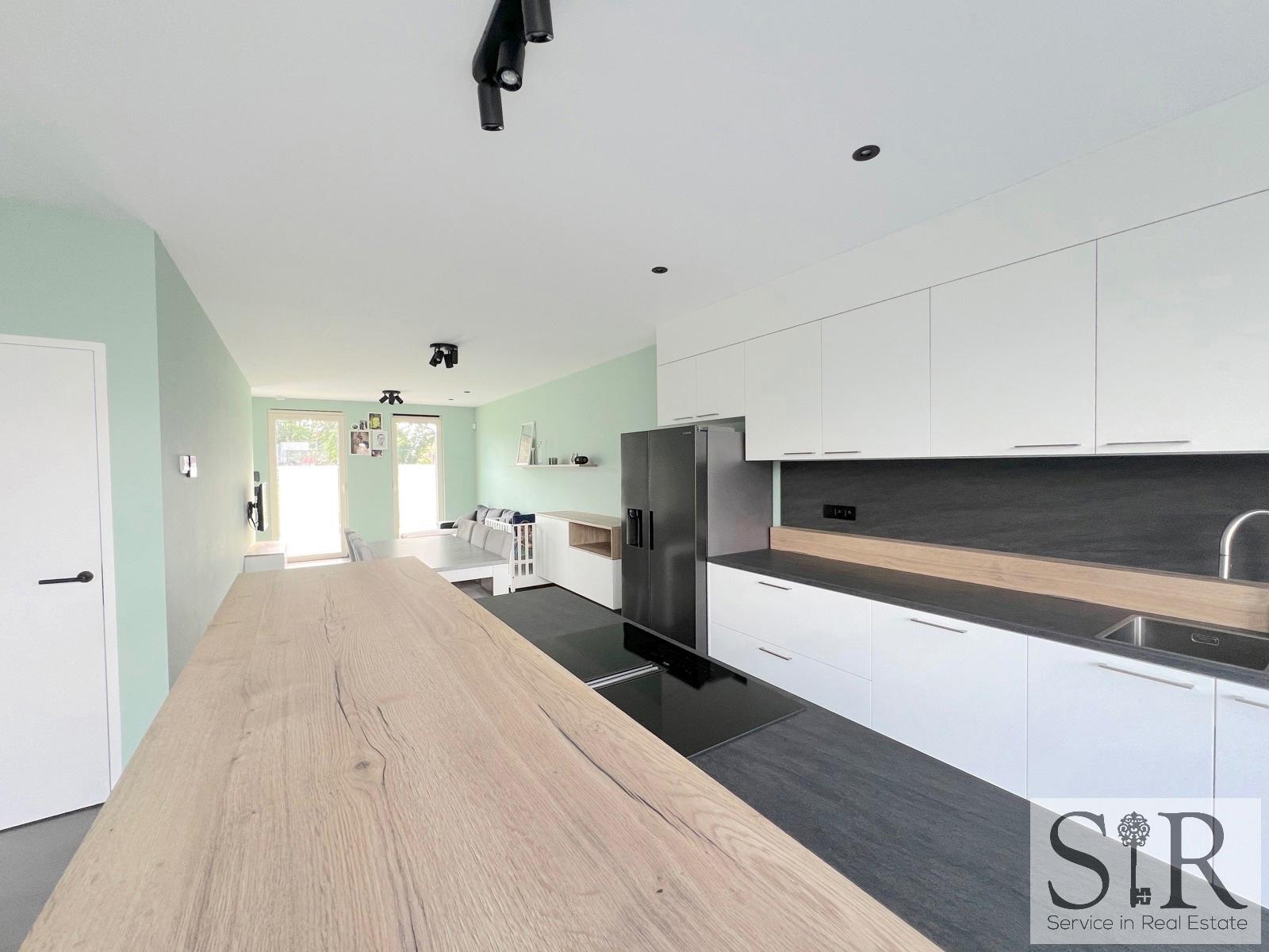 De woning beschikt over een inkomhal met gastentoilet. Via de grote raampartijen baden de living en de grote, open leefkeuken in het licht. Aan de keuken is nog een berging. De keuken is uitgerust met een amerikaanse koelkast, inductiekookplaat, oven en vaatwasmachine. Het grote schuifraam in de living geeft uit op de tuin met achteraan een tuinhuis. De tuin beschikt over 2 terrassen, zo hebt u de keuze om van de zon te genieten of wat in de koelte van de schaduw te zitten. Achteraan de tuin bevindt er zich een achteruitgang die uitkomt op een (fiets)pad. De zuid-gerichte ramen zijn uitgerust met zonnenscreens.